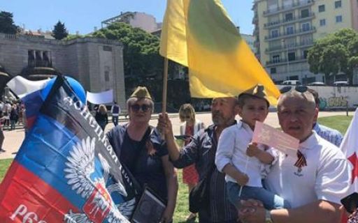 Делегация РФ в канун Евровидения-2018 устроила в Лиссабоне (Португалия) акцию "Бессмертный полк", в рамках которой люди вынесли флаги и так называемых "ЛНР" и "ДНР". Эти люди также "красовались" в пилотках и с георгиевской лентой.