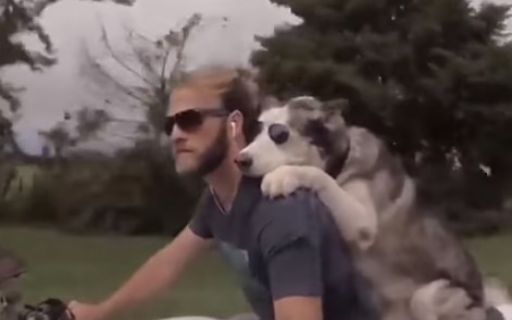 Увлекательное видео появилось на днях в социальных сетях - на кадрах видно как молодой человек рассекает на байке, а за спиной него сидит хаски в очках, которому, судя по всему, поездка очень нравится.