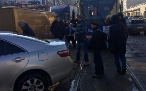 Владелец иномарки, видимо, забыв про правила приличия и правила дорожного движения, оставил свое транспортное средство на проезжей части таким образом, что оно блокировало движение трамваев