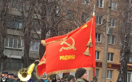 Военнослужащие Национальной Гвардии 22 февраля провели парад в Кривом Роге, а во время своего праздничного шествия по случаю освобождения города от фашистов, молодые люди несли красное знамя с символикой СССР