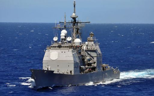 Российские и американские военные корабли практически сталкиваются во время опасного маневрирования. Аэрофотоснимок показывает, что российский "Адмирал Виноградов" и американский USS Chancellorsville находятся в опасной близости друг от друга
