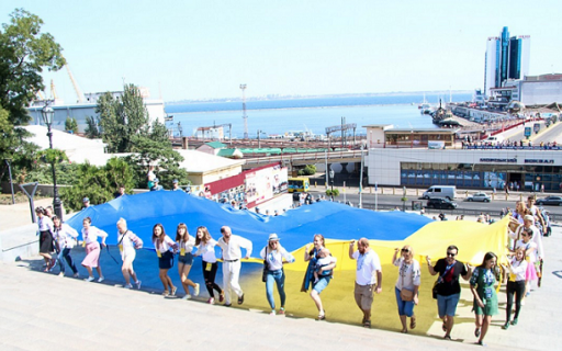 27-метровый флаг Украины развернули сегодня на Потемкинской лестнице волонтеры Вышиванкового фестиваля и курсанты Института ВМСУ. Эта традиционная акция посвящена Дню государственного флага, который отмечается сегодня.