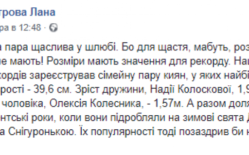Национальный реестр рекордов зарегистрировал семейную пару киевлян с наибольшей разницей в росте. Разница между супругами достигла 39,6 сантиметра. Рост жены, Надежды Колосковой - 1,96 метра, а рост ее мужа, Алексея Колесника, - 1,57 метра.