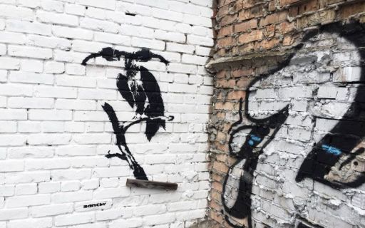 В ночь на 27 июля в столице Украины на заправке электромобилей, а также на стене здания рядом с ней появилось несколько граффити, подписанных известным художником Бэнкси