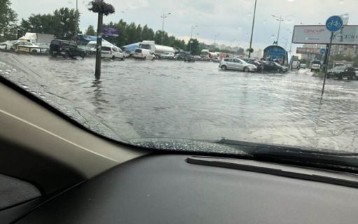 Вечером, 17 июля, на некоторые районы Киева обрушился мощный ливень, из-за которого было затруднено движение транспорта. Некоторые владельцы авто даже потеряли номера, пробираясь через поток воды.