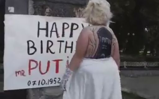 Тучная активистка Femen взобралась на декоммунизированный памятник в образе Мэрилин Монро и спела легендарную песню артистки "Happy birthday, mr. president"