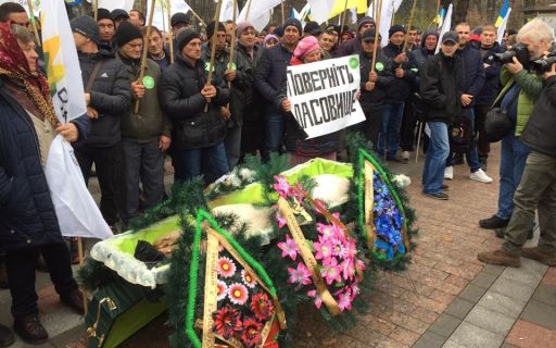 В Киеве у стен Верховной Рады проходят митинги протеста, люди требуют не продавать украинские земли, они принесли свинью в гробу и "хоронят" животноводство