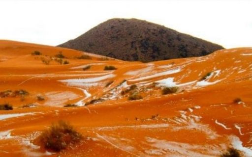 В третий раз за почти четыре десятилетия в песчаных дюнах Сахары выпал снег - местные жители близлежащего алжирского городка Айн Сефа ошеломлены подобным явлением